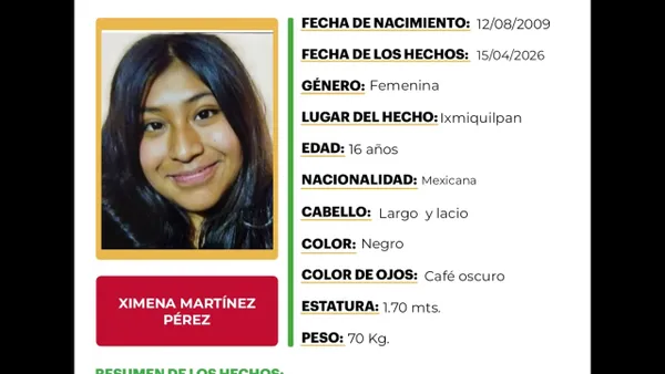 Activan Alerta Amber en Hidalgo por la desaparición de Ximena Martínez Pérez, de 16 años, en Ixmiquilpan. Conoce sus señas particulares y ayúdanos a localizarla.