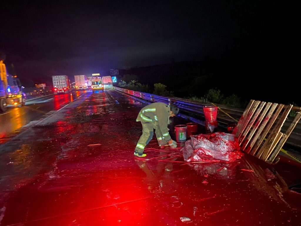 Derivado de la coalición, parte de la carga, es decir, botes de pintura, se cayeron sobre la cinta asfáltica y con la lluvia que se registró la tarde- noche en Tepeji, la pintura corrió hasta llegar al afluente.