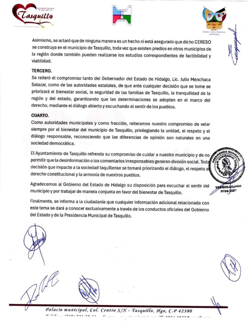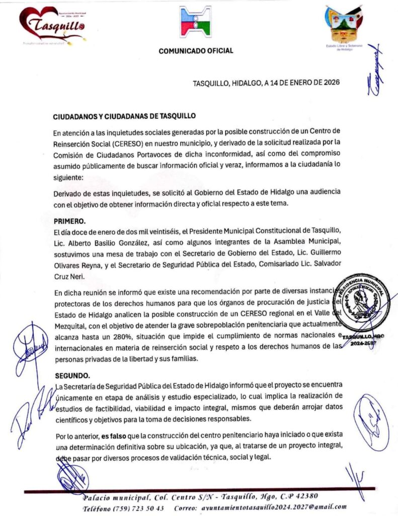 Por lo anterior, las autoridades municipales aseguraron que es falso que el gobierno haya iniciado con la construcción del Cereso en Tasquillo, o bien que esto sea ya una determinación definitiva.