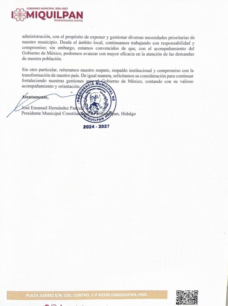 De acuerdo a una publicación del edil Hernández Pascual, se logró hacer entrega de un documento en el cual le agradecen por más de 60 millones de pesos que fueron destinados a Ixmiquilpan a través del programa FAISPIAM, mismo que serán destinados para el beneficio de 103 comunidades.