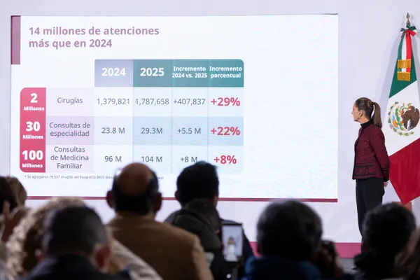 La presidenta de México, Claudia Sheinbaum Pardo, subrayó los avances significativos en el sector salud durante el año 2025, destacando el incremento en cirugías y consultas de especialidad en el Instituto Mexicano del Seguro Social (IMSS), el IMSS Bienestar y el Instituto de Seguridad y Servicios Sociales de los Trabajadores del Estado (ISSSTE).