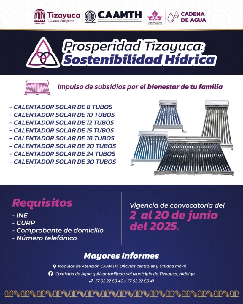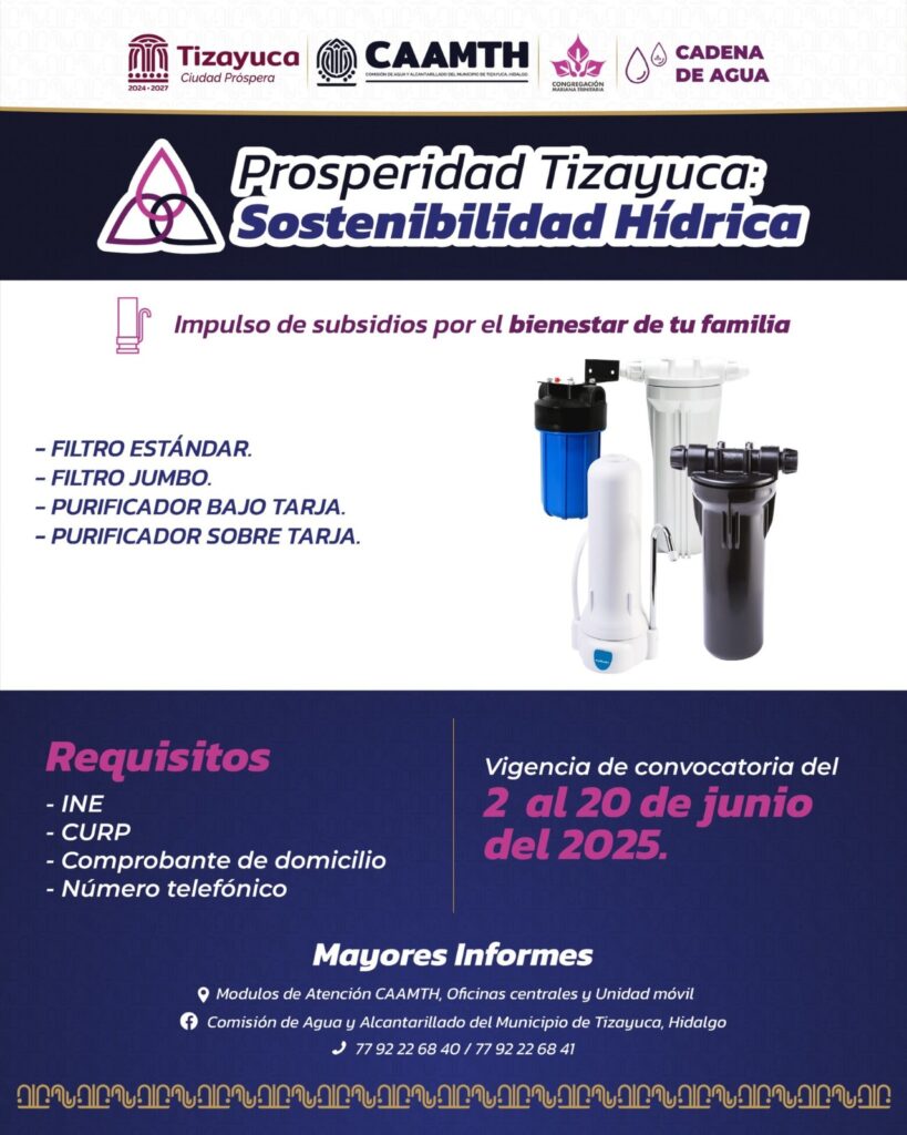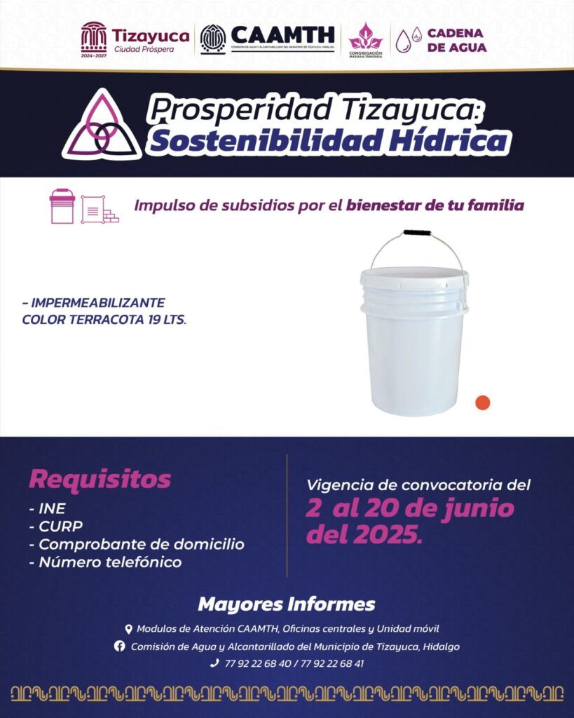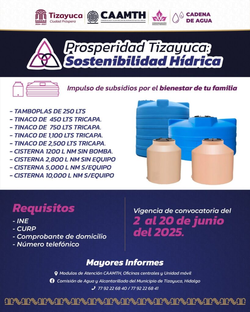Del 2 al 20 de junio estará abierta la convocatoria de la segunda convocatoria del programa “Prosperidad Tizayuca Sostenibilidad Hídrica”, una iniciativa que busca mejorar la calidad de vida de las y los tizayuquenses a través del acceso a un recurso vital: el agua. Este programa, se realiza en colaboración con la Congregación Mariana Trinitaria, y tiene como objetivo proporcionar subsidios que permitan a más familias contar con sistemas de almacenamiento seguros y dignos para el agua potable en sus hogares.