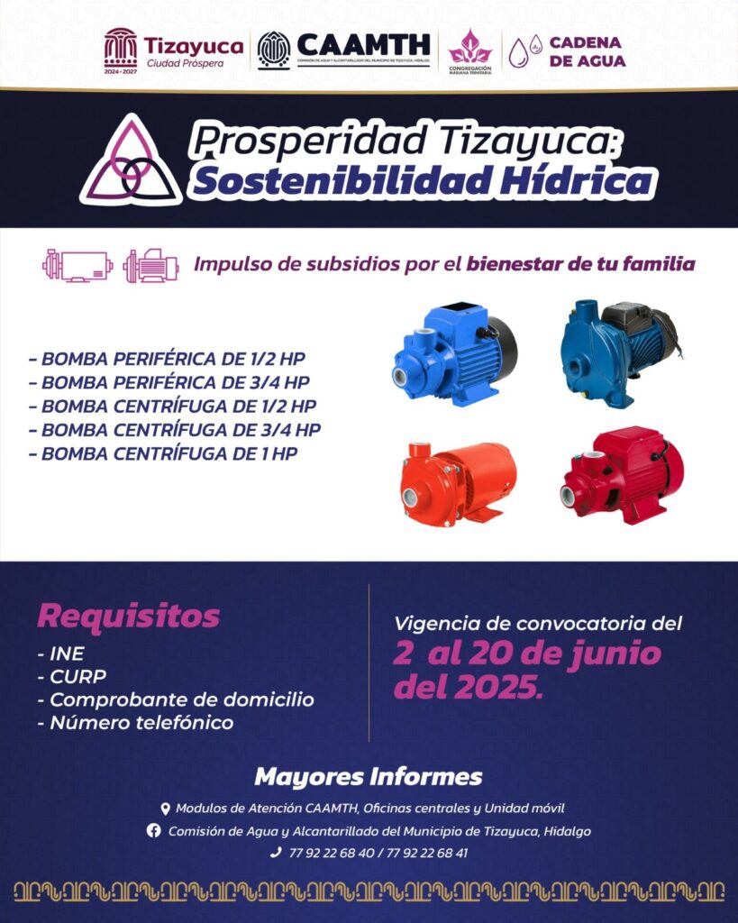 La nueva convocatoria estará vigente desde hoy 2 de junio hasta el 20 de junio de 2025. Invitamos a todas las familias interesadas a acercarse a las oficinas de la CAAMTH, ubicadas en Av. Juárez Norte #39, El Pedregal, Tizayuca, Hidalgo. También podrán encontrar información en las sedes de la CAAMTH en Plaza Alameda, Haciendas de Tizayuca, Fraccionamiento Rancho Don Antonio y en la Unidad Móvil. Para más detalles, pueden comunicarse al 5561987531.